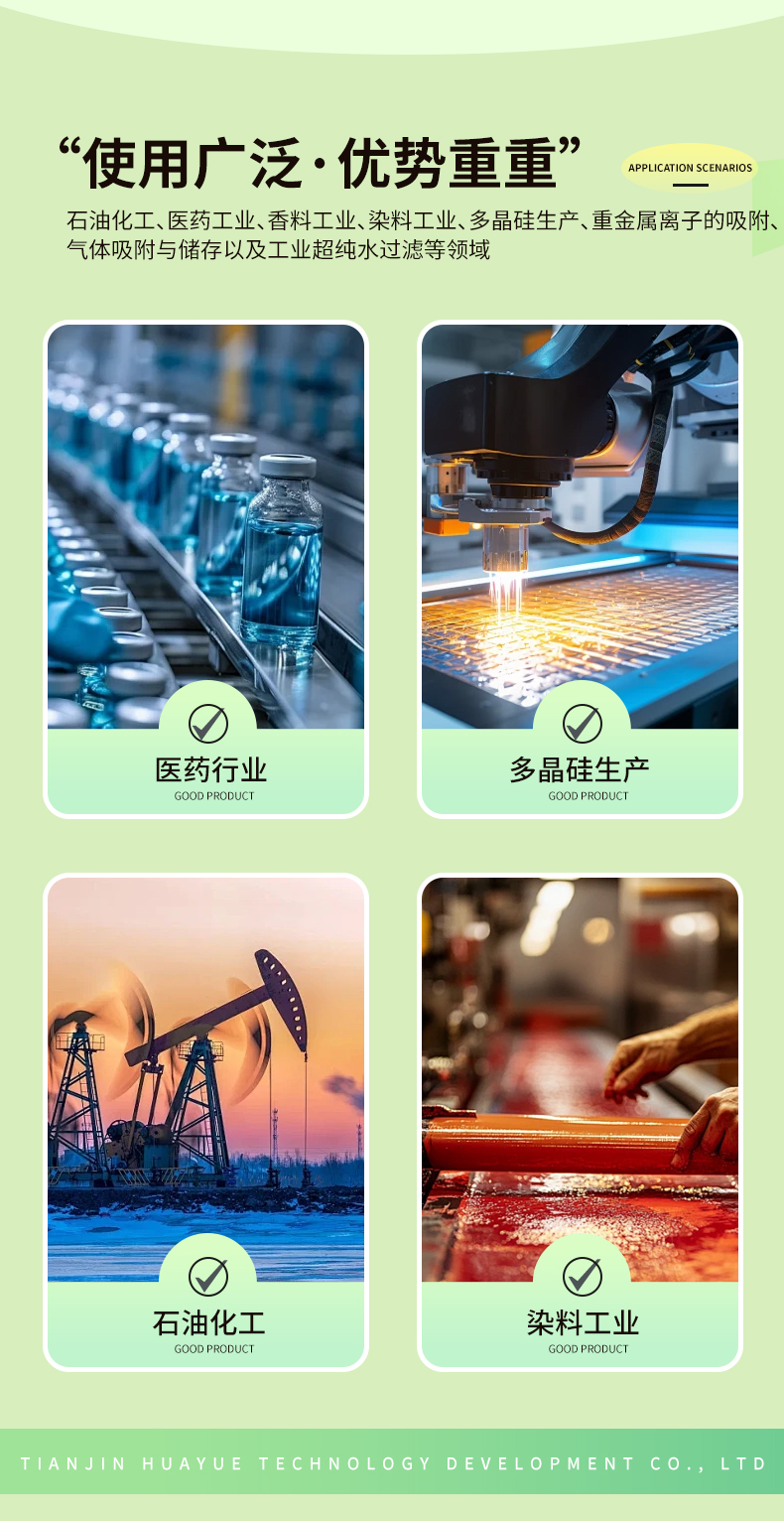 天津华跃科技开发有限公司是一家专注于新型活性炭的研发、生产、加工、销售为一体的高科技现代化企业,坐落于天津市西青经济技术开发区,赛达检测认证园。公司主营活性炭的研发及制造,包含苯乙烯系、丙烯酸系,离子交换树脂大孔吸附树脂、树脂基球炭等产品,广泛应用于冶金、石油、电力、水务、化工、食品、饮料、纺织、贵金属提取等工业及民用领域。公司以技术创新为核心驱动,产品远销美、韩、日等外贸市场及国内多个省份,本公司自成立以来一直秉承着诚信经营的原则。我们也会不断更新产品,做好售前、售中,售后的每一道服务,努力给顾客一个好的购买体验。天津华跃科技开发有限公司以诚信、实力和产品质量获得了业界的认可,我们也将注入更多心血、更多的热情、更大的努力。欢迎各界朋友莅临参观、指导和业务洽谈。